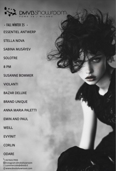 Brands: Ahlvar Gallery, Alessandro Enriquez, Allude (+ Men), Arma (+ Men), Baum Und Pferdgarten, Berwich, Bruno Manetti (+ Men), Charo Ruiz, Crida, Desantis By Alvarez, Eleonora Gottardi, Elise Gug, Kitagi, Kujten, L'Agence, Lutz Huelle, Mouche, Palmer Harding, Patbo, Psophia, Stand Studio, Studio AR, Valentini 1972, Vanessa Baroni, Vert Lago, Windsor (+ Men).
