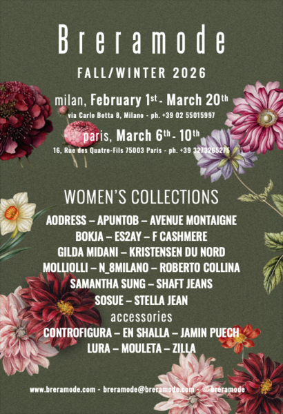 Brands RTW: Aodress, Apuntob, Avenue Montaigne, Bokja, ES2AY, F Cashmere, Gilda Midani, Kristensen du Nord, Molliolli, N_8Milano, Roberto Collina, Samantha Sung, Shaft Jeans, Sosue, Stella Jean.