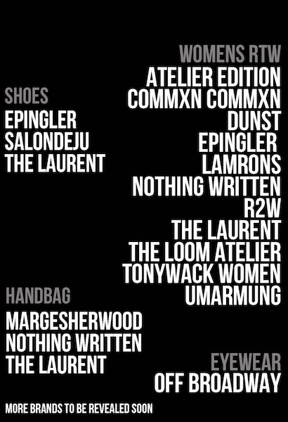 Brands: ALZ, Atelier Yscm, Caterina Leman, Esther Noriega, Jenne, Monica Leigh, Ritesh Kumar, Sari Lazaro, Siyu, Tatuum, Daily Mirror, Jinn, Lehee Cashmere, Soetart, Vente, Alessandra Grimoldi, Ananyan, Nadya Toto, Paloma Suarez, Axel Accessories.
