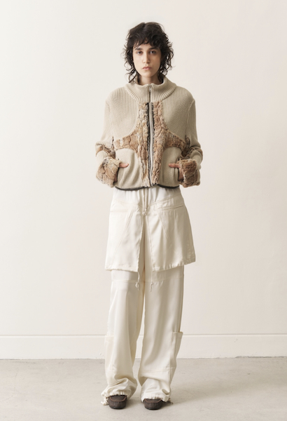 MÜNN approaches each season with a philosophy of “defamiliarization,” reinterpreting the familiar through an unfamiliar lens. For the 26F/W season, the collection explores a series of experiments rooted in military garments. Furthermore this collection expands its material exploration: sweaters knitted from recycled paper, dresses constructed from discarded banners, and bustiers hand-woven from elastic bands reflect an ongoing interest in unconventional and sustainable materials and alternative methods of construction. Through these transformations, the collection challenges traditional perceptions of military design, balancing structure with softness, and function with poetic experimentation.