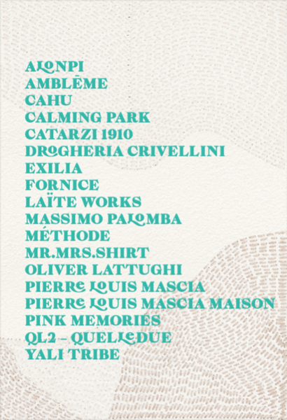 Brands: Alonpi, Ambleme, Cahu, Calming Park, Catarzi1910, Drogheria Crivellini, Exilia, Fornice, Laite Works, Massimo Palomba, Methode, Mr.Mrs.Shirt, Oliver Lattughi, Pierre Louis Mascia, Pierre Louis Mascia Maison, Pink Memories, QL2 - Quelledue, Yali Tribe.