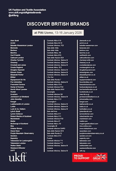 Brands: Babette Wasserman, Baracuta, Barbour, Carl Friedrik, Charles Tyrwhitt, Cheaney, Crockett & Jones, Croots England, Douglas Hayward, Edward Green, Elizabeth Parker, Elliker, Fox Umbrellas, Hardy & Parsons, Harris Wharf London, Invertère, Jamieson’s of Shetland, John Smedley, Kangol, Leathersmith of London, Loake, Mou, Sanders, Tateossian London, Walker Slater and Cathcart London, Oscar Deen, Lynne Coleman and Purple Mountain Observatory.