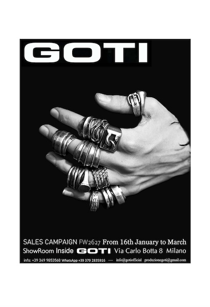 Goti is an Italian brand born in September 2000 from the will of Riccardo Goti to realize his creative vision, a Sartorial Jewel. A production that combines the tradition of craftsmanship with a contemporary philosophy. An indissoluble union between Dress and Jewel. Alchemy of fabrics and small precious elements, cuts of leather with castings metal the delicacy of the yarns applied sartorially with the power of hand-worked silver.
