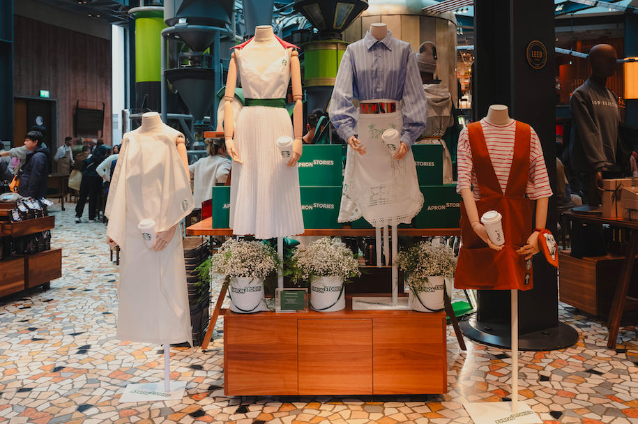 Finally, Sara Battaglia redesigned the iconic Starbucks apron through the lens of her brand's codes. "The Red Collar as a signature identity, and Plissé Discipline as a construction method. A practical piece that flatters and elevates, bringing a precise meaning, where aesthetics and function meet."