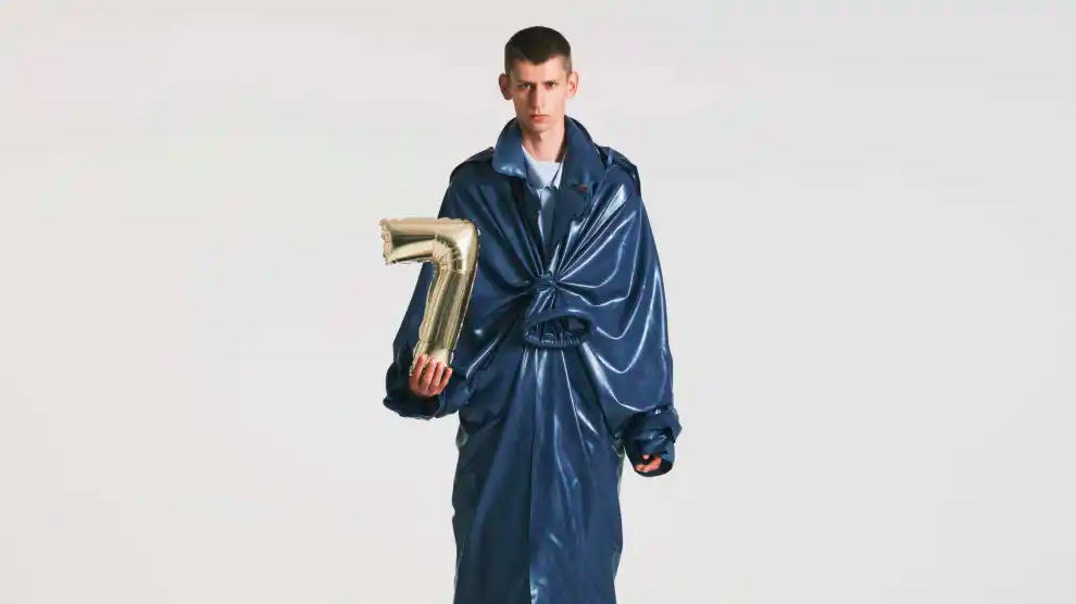 A graduate of Brussels’ La Cambre school, and most recently worked at Maison Margiela for the Artisanal collections, he presented a collection inspired by the Ivy style of the 1960s and voluminous balloons. The collection uses joyful and familiar objects such as jeans, a trench coat, an easel, and a red balloon; it attempts to introduce new ideas through the play of combinations.