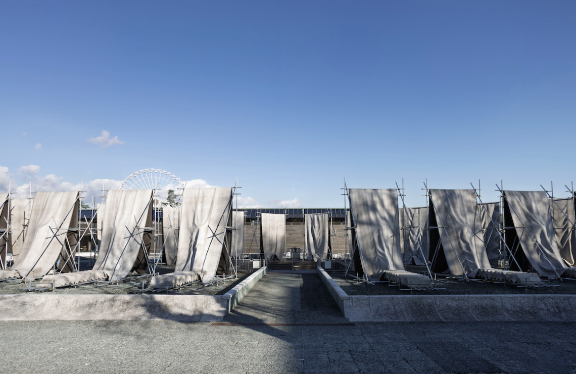 Conceived as a large-scale spatial intervention, the project spans the 1,700 square meters of the forecourt and is composed of 18 monoliths, each measuring 5 meters high, 3 meters wide, and 9 meters deep. The structures are constructed with scaffolding systems covered in concrete canvas, a material that has become emblematic of Leschelier's work in recent years.